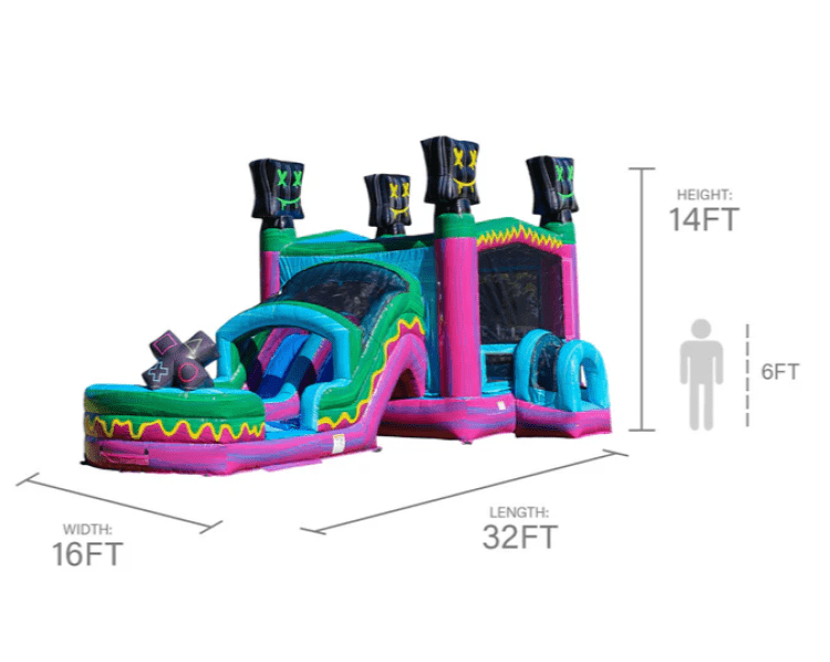Take your party to the next level with the Level Up Dual Lane Combo! This vibrant gamer-themed inflatable brings the excitement of your favorite video games to life — complete with bold graphics, bright colors, and action-packed fun for everyone.