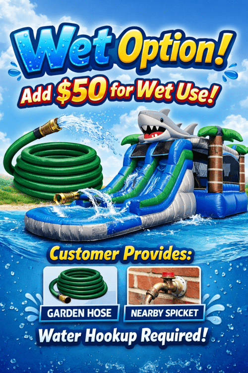 Adds water flow to the slide using a garden hose connection, creating a fun water-slide experience. Includes wet setup, water distribution, and additional cleaning after use.